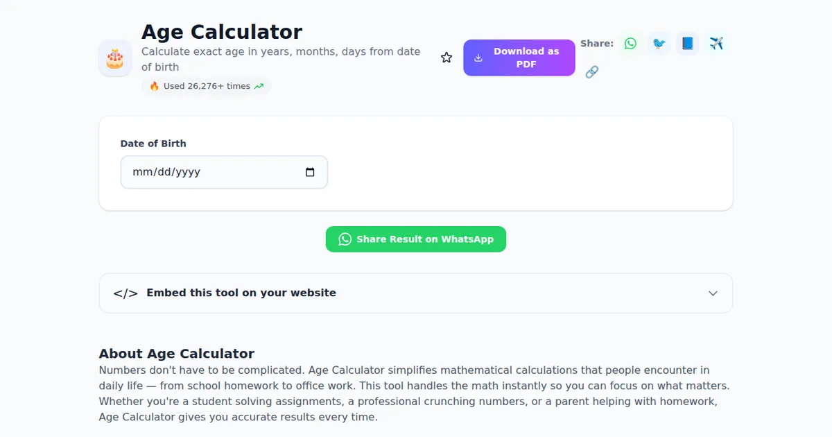 Age Calculator uses industry-standard formulas and calculations. The results are mathematically precise and reliable for personal, academic, and professional use. For critical decisions, we recommend consulting a relevant professional.