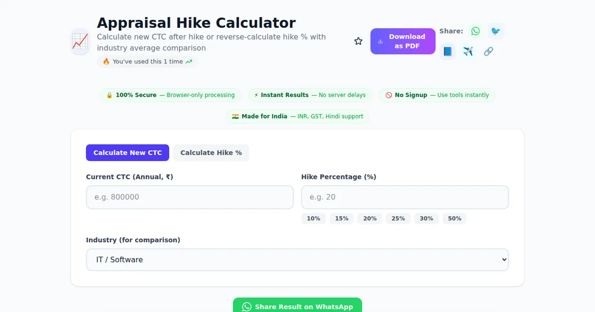 Appraisal Hike Calculator is a free online tool that helps you calculate new ctc after hike or reverse-calculate hike % with industry average comparison. It's part of SabTools.in's collection of 460+ free tools designed for Indian users. People commonly search for appraisal, hike, salary hike when they need this type of tool.