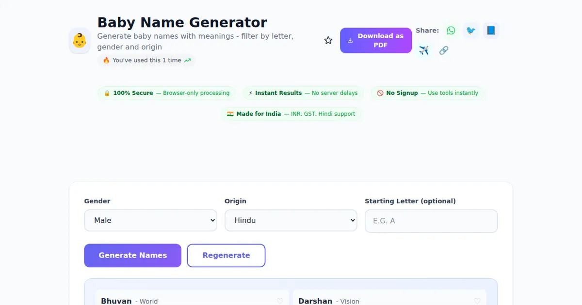Baby Name Generator on SabTools.in is the fastest, easiest, and most reliable way to generate baby names with meanings - filter by letter, gender and origin. It's free, private, works on any device, and requires zero signup. Join thousands of Indians who use this tool daily.