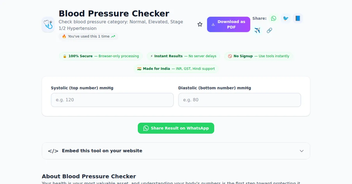 Blood Pressure Checker on SabTools.in is the fastest, easiest, and most reliable way to check blood pressure category: normal, elevated, stage 1/2 hypertension. It's free, private, works on any device, and requires zero signup. Join thousands of Indians who use this tool daily.