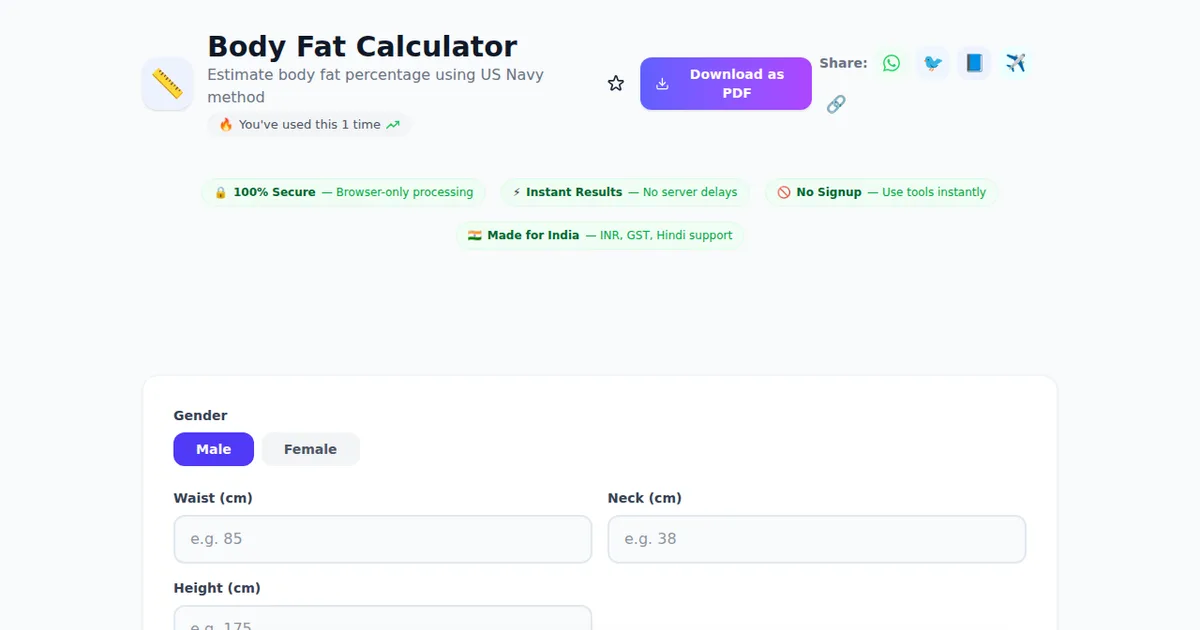 Body Fat Calculator on SabTools.in is the fastest, easiest, and most reliable way to estimate body fat percentage using us navy method. It's free, private, works on any device, and requires zero signup. Join thousands of Indians who use this tool daily.