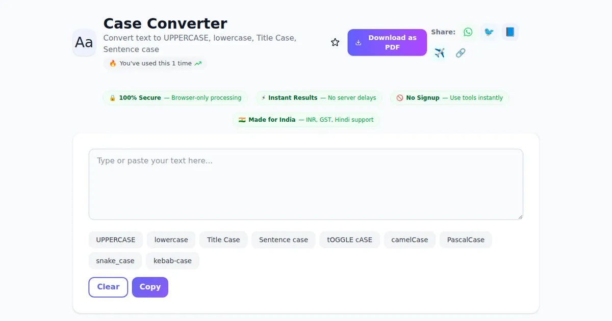 Case Converter on SabTools.in is the fastest, easiest, and most reliable way to convert text to uppercase, lowercase, title case, sentence case. It's free, private, works on any device, and requires zero signup. Join thousands of Indians who use this tool daily.