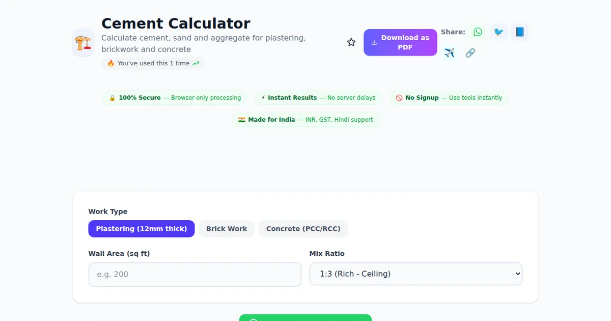 Cement Calculator on SabTools.in is the fastest, easiest, and most reliable way to calculate cement, sand and aggregate for plastering, brickwork and concrete. It's free, private, works on any device, and requires zero signup. Join thousands of Indians who use this tool daily.