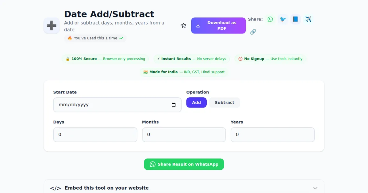 Date Add/Subtract on SabTools.in is the fastest, easiest, and most reliable way to add or subtract days, months, years from a date. It's free, private, works on any device, and requires zero signup. Join thousands of Indians who use this tool daily.