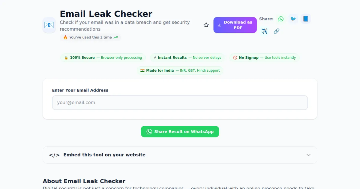 With over 460+ free tools available on SabTools.in, Email Leak Checker is one of the most popular choices among Indian users. Whether you're a student, professional, or business owner, this tool helps you save time and get accurate results instantly. No registration, no fees โ just open and use.