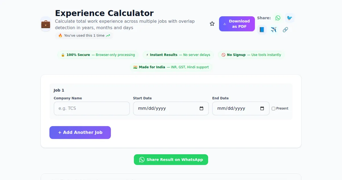 Experience Calculator on SabTools.in is the fastest, easiest, and most reliable way to calculate total work experience across multiple jobs with overlap detection in years, months and days. It's free, private, works on any device, and requires zero signup. Join thousands of Indians who use this tool daily.