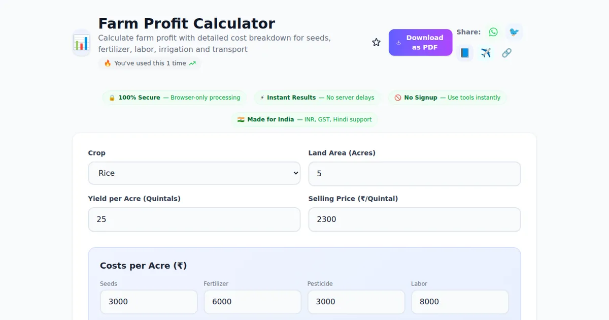 Open ToolThe right tool makes all the difference. If you're looking for a reliable farm profit calculator online free, you've come to the right place. Farm Profit Calculator on SabTools.in is a powerful, free online tool that helps you calculate farm profit with detailed cost breakdown for seeds, fertilizer, labor, irrigation and transport. It works instantly in your browser — no downloads, no signups, no fees.