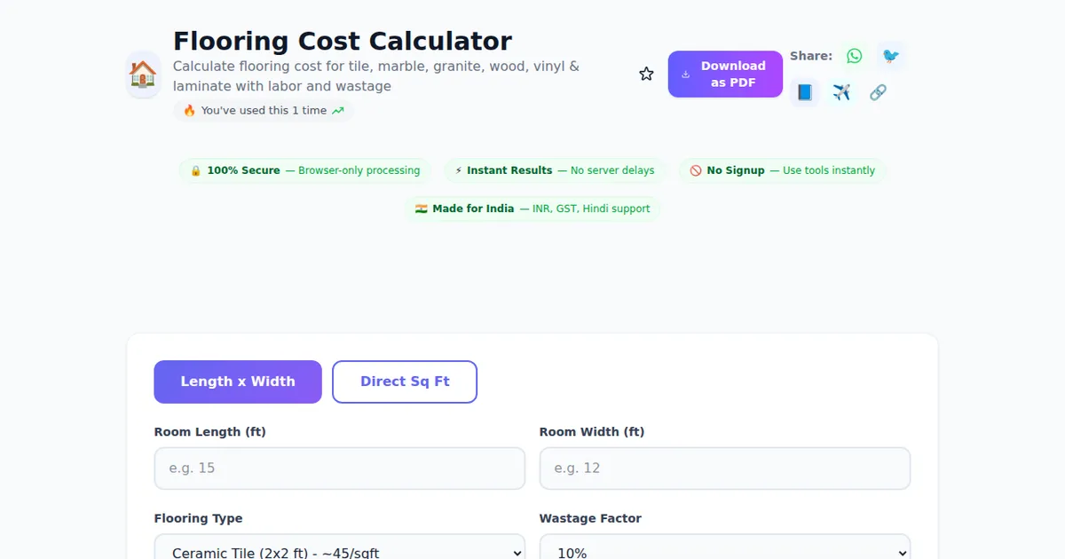 Flooring Cost Calculator on SabTools.in is the fastest, easiest, and most reliable way to calculate flooring cost for tile, marble, granite, wood, vinyl & laminate with labor and wastage. It's free, private, works on any device, and requires zero signup. Join thousands of Indians who use this tool daily.