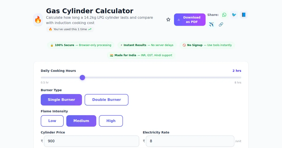 Gas Cylinder Calculator on SabTools.in is the fastest, easiest, and most reliable way to calculate how long a 14.2kg lpg cylinder lasts and compare with induction cooking cost. It's free, private, works on any device, and requires zero signup. Join thousands of Indians who use this tool daily.