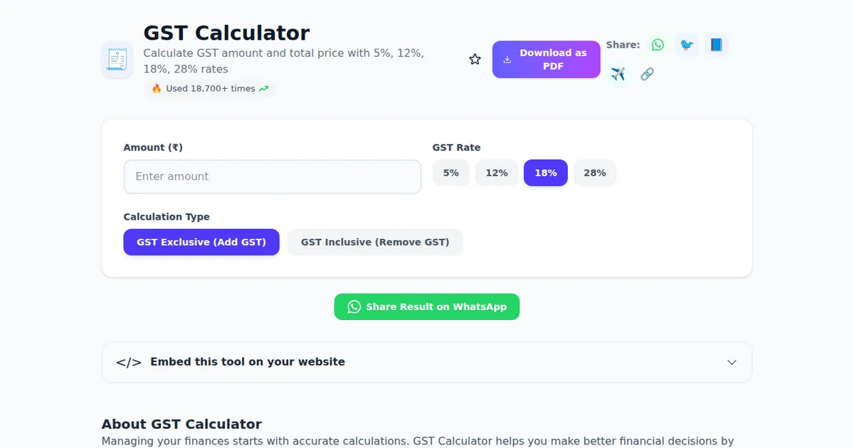 Open ToolFinancial planning starts with the right calculations. If you're looking for a reliable gst calculator online free, you've come to the right place. GST Calculator on SabTools.in is a powerful, free online tool that helps you calculate gst amount and total price with 5%, 12%, 18%, 28% rates. It works instantly in your browser โ no downloads, no signups, no fees.
