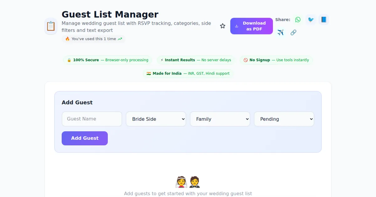 Guest List Manager on SabTools.in is the fastest, easiest, and most reliable way to manage wedding guest list with rsvp tracking, categories, side filters and text export. It's free, private, works on any device, and requires zero signup. Join thousands of Indians who use this tool daily.