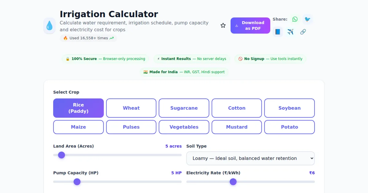 Irrigation Calculator on SabTools.in is the fastest, easiest, and most reliable way to calculate water requirement, irrigation schedule, pump capacity and electricity cost for crops. It's free, private, works on any device, and requires zero signup. Join thousands of Indians who use this tool daily.