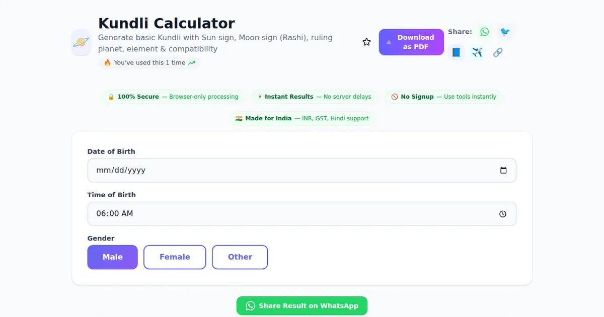Kundli Calculator on SabTools.in is the fastest, easiest, and most reliable way to generate basic kundli with sun sign, moon sign (rashi), ruling planet, element & compatibility. It's free, private, works on any device, and requires zero signup. Join thousands of Indians who use this tool daily.