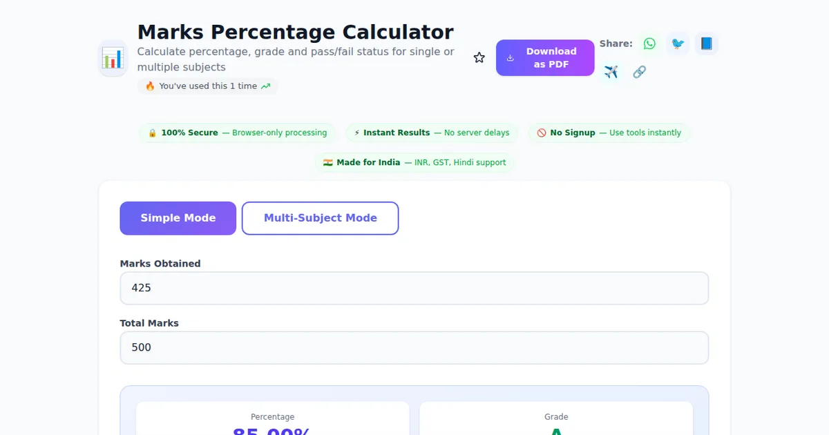 Marks Percentage Calculator on SabTools.in is the fastest, easiest, and most reliable way to calculate percentage, grade and pass/fail status for single or multiple subjects. It's free, private, works on any device, and requires zero signup. Join thousands of Indians who use this tool daily.