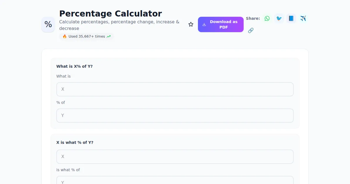 In this complete guide, we'll show you everything about Percentage Calculator โ how it works, key features, step-by-step instructions, expert tips, and answers to frequently asked questions. Whether you're in India or anywhere else, this tool is built to save you time and deliver accurate results.