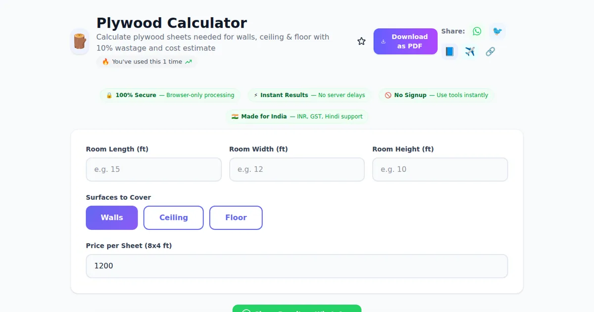 Plywood Calculator on SabTools.in is the fastest, easiest, and most reliable way to calculate plywood sheets needed for walls, ceiling & floor with 10% wastage and cost estimate. It's free, private, works on any device, and requires zero signup. Join thousands of Indians who use this tool daily.