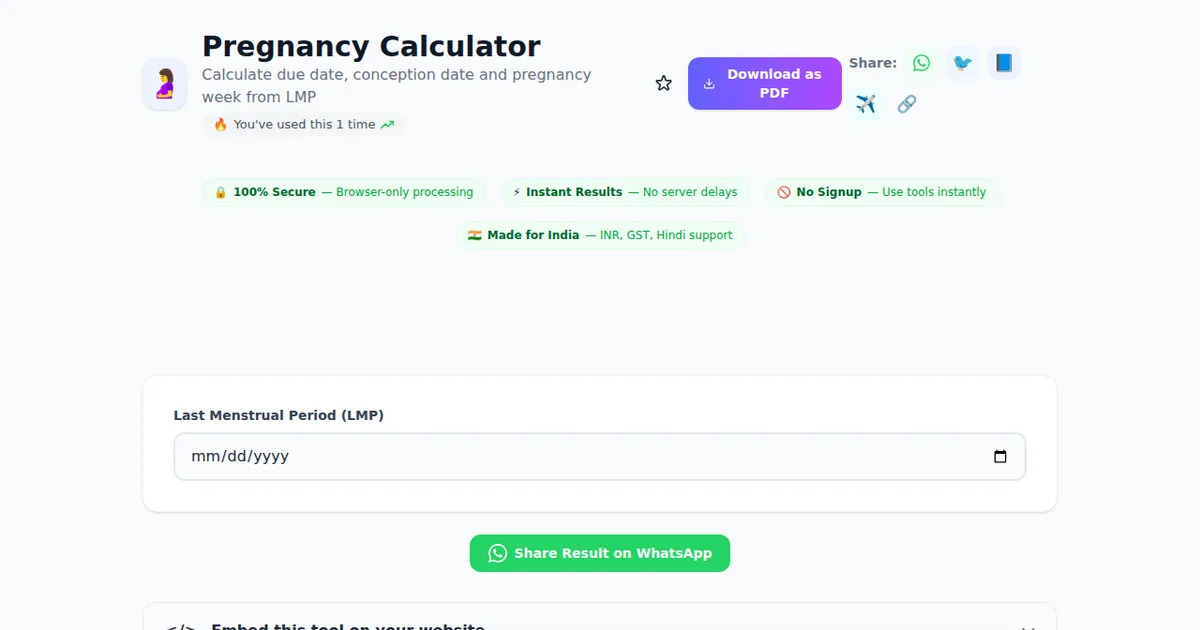 - SabTools Pregnancy Calculator: Accepts LMP, calculates EDD, conception date, current week, current trimester, and days remaining. Indian date formats (DD/MM/YYYY) work natively.