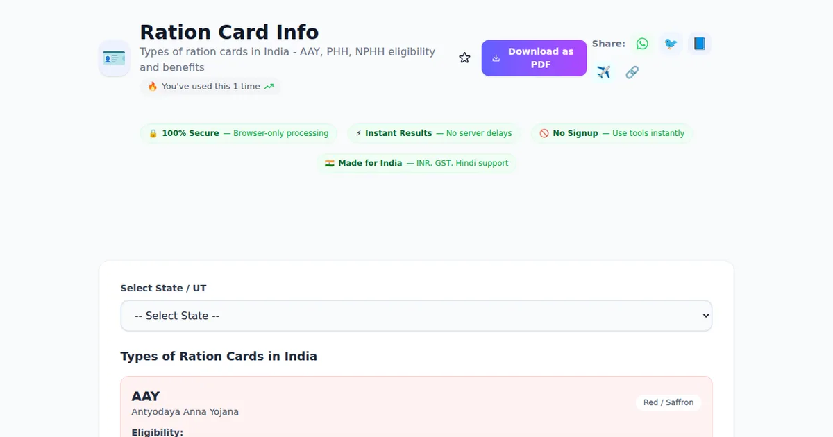 Ration Card Info on SabTools.in is the fastest, easiest, and most reliable way to types of ration cards in india - aay, phh, nphh eligibility and benefits. It's free, private, works on any device, and requires zero signup. Join thousands of Indians who use this tool daily.