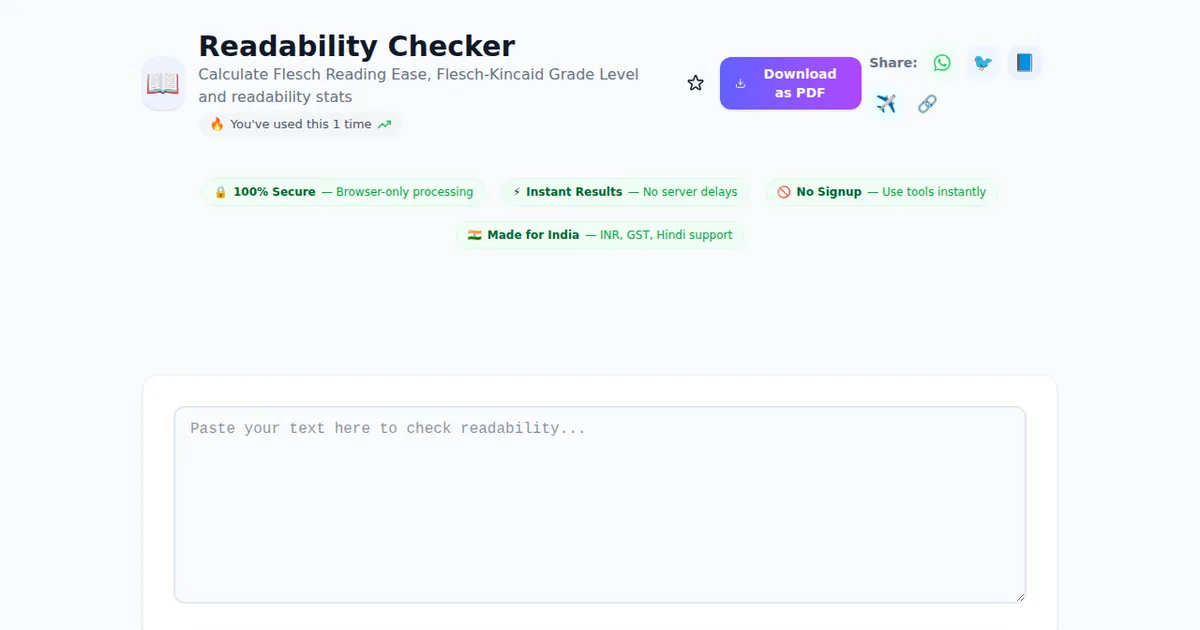 With over 460+ free tools available on SabTools.in, Readability Checker is one of the most popular choices among Indian users. Whether you're a student, professional, or business owner, this tool helps you save time and get accurate results instantly. No registration, no fees — just open and use.