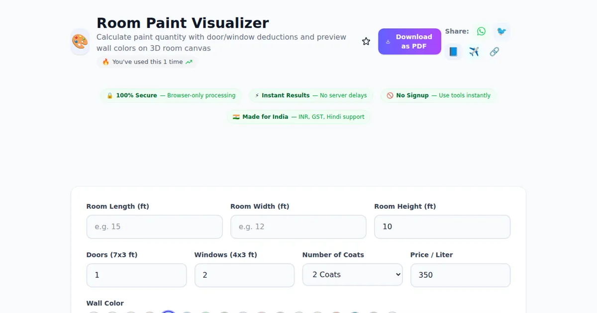 Room Paint Visualizer on SabTools.in is the fastest, easiest, and most reliable way to calculate paint quantity with door/window deductions and preview wall colors on 3d room canvas. It's free, private, works on any device, and requires zero signup. Join thousands of Indians who use this tool daily.
