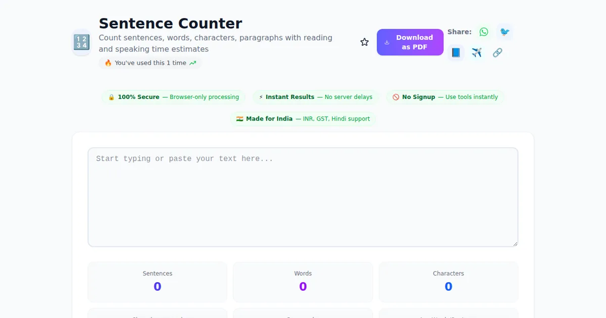 Sentence Counter on SabTools.in is the fastest, easiest, and most reliable way to count sentences, words, characters, paragraphs with reading and speaking time estimates. It's free, private, works on any device, and requires zero signup. Join thousands of Indians who use this tool daily.