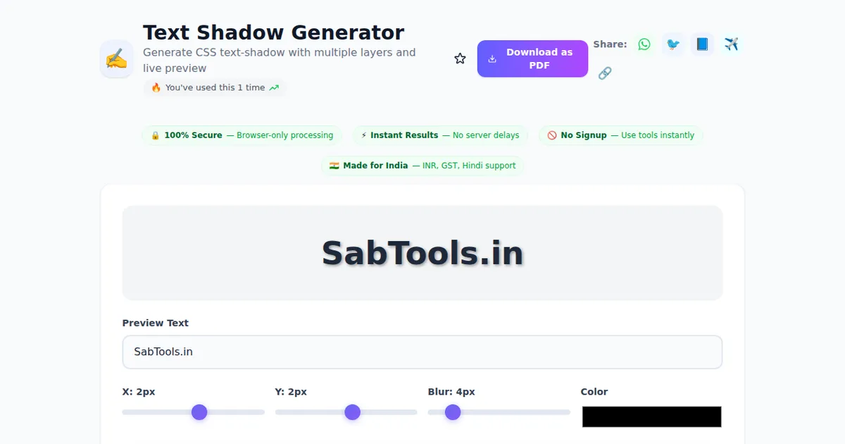 Text Shadow Generator on SabTools.in is the fastest, easiest, and most reliable way to generate css text-shadow with multiple layers and live preview. It's free, private, works on any device, and requires zero signup. Join thousands of Indians who use this tool daily.