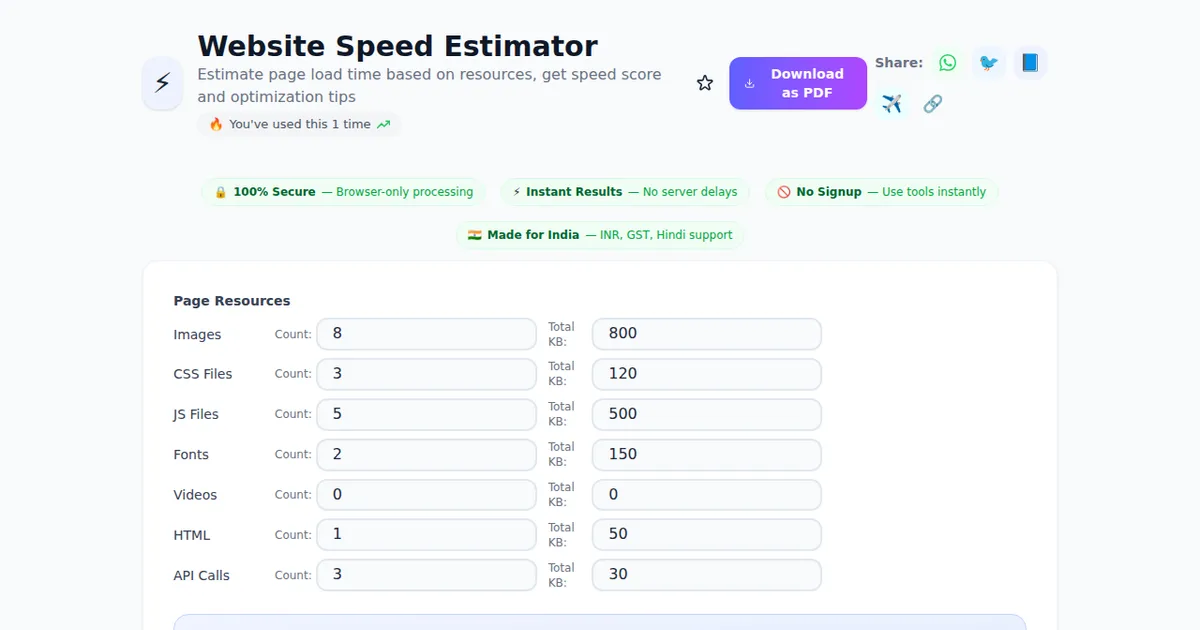 Website Speed Estimator on SabTools.in is the fastest, easiest, and most reliable way to estimate page load time based on resources, get speed score and optimization tips. It's free, private, works on any device, and requires zero signup. Join thousands of Indians who use this tool daily.