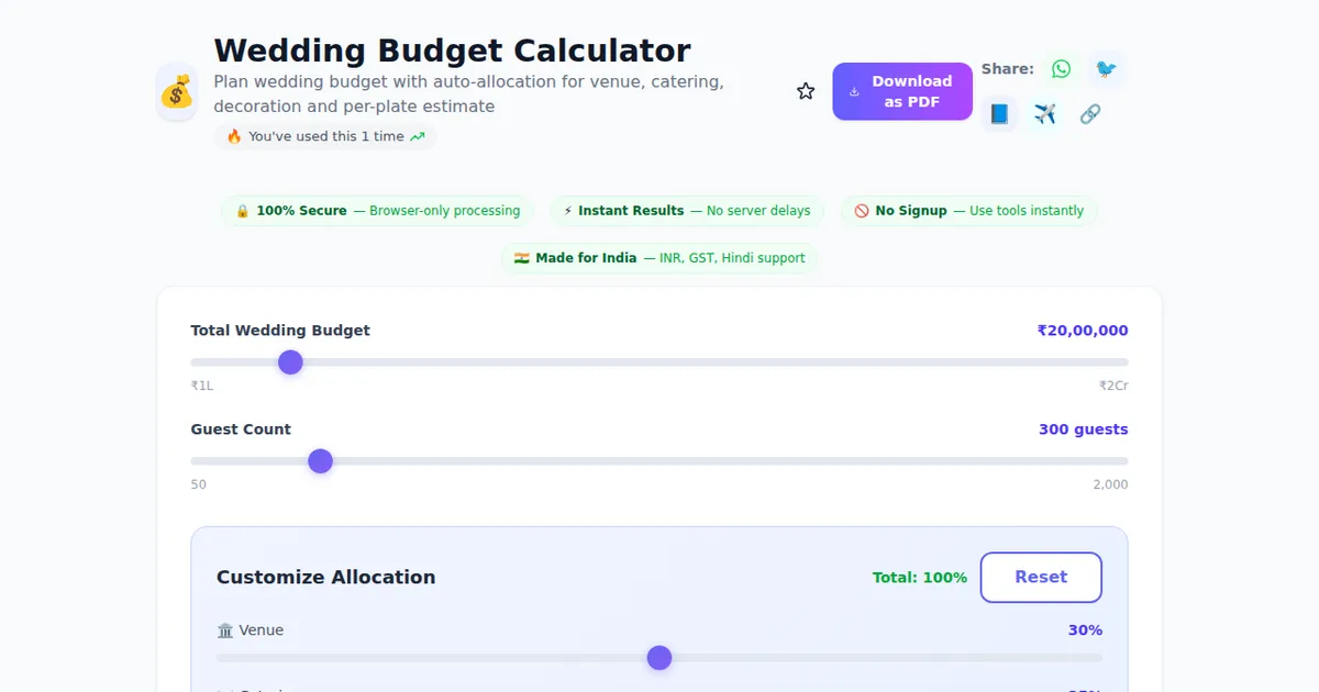 Wedding Budget Calculator on SabTools.in is the fastest, easiest, and most reliable way to plan wedding budget with auto-allocation for venue, catering, decoration and per-plate estimate. It's free, private, works on any device, and requires zero signup. Join thousands of Indians who use this tool daily.