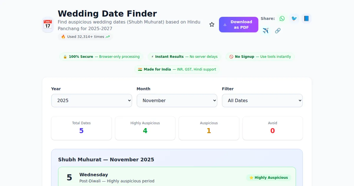 Open ToolFree online tools are changing how we work. If you're looking for a reliable wedding date finder online free, you've come to the right place. Wedding Date Finder on SabTools.in is a powerful, free online tool that helps you find auspicious wedding dates (shubh muhurat) based on hindu panchang for 2025-2027. It works instantly in your browser — no downloads, no signups, no fees.
