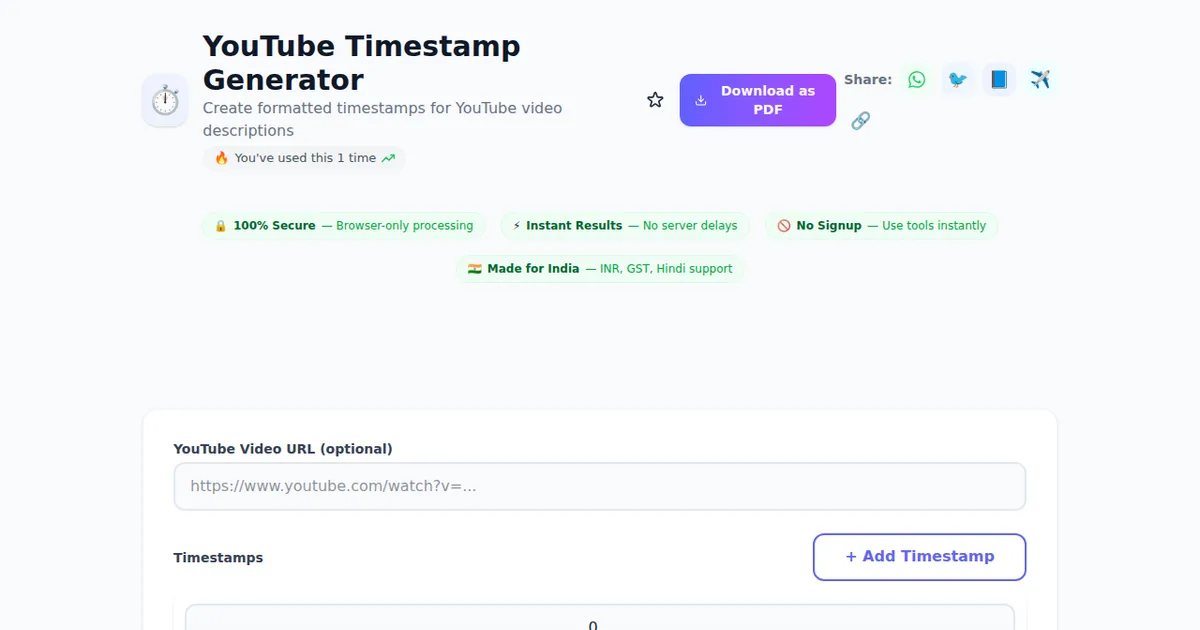 YouTube Timestamp Generator is built specifically for Indian users. The interface supports Indian numbering (lakhs, crores), INR formatting, and references Indian standards and regulations where applicable. With 900+ million internet users in India, we've designed this tool to be fast even on 3G/4G networks and work smoothly on budget smartphones.